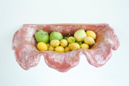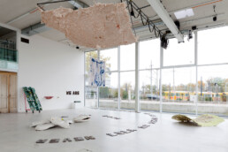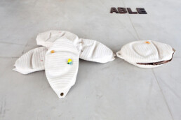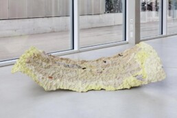 For her new, specially commissioned installation at der TANK, Raffaela has created a distilled version of all these impressions we receive from life. There is a sculpture-skin and a sculpture-roof and a text-window and a sound-music… All of them inhabit a concrete cube, which serves as both an exhibition space and a sculpture workshop. It is for this matter that she chose these elements, the elements that she did in her workshop, at home and transported them here, to der TANK—a space that promises a certain neutrality, because of its square form and the transparency of the glass, but is actually no less than a roof, a shelter, a home to all the sculptures being made here. It is as if Raffaela wanted to tell der TANK about all the lemons in the world, about the memories that spaces possess and how the memories of her house, herself, her city merge with the memories of a space that seems “outside” of tradition, casted by architects in a new part of the city of Basel. But also, how moving to be able to be touched by all the artworks and the people. At times, we accept the space as a test site; at others, as an exhibition space.